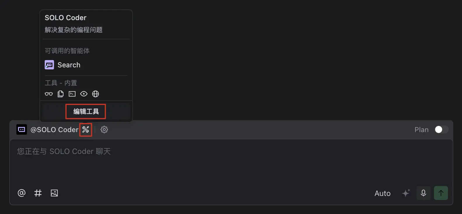 你可为 SOLO Coder 配置可调用的自定义智能体、MCP Server 及内置工具。