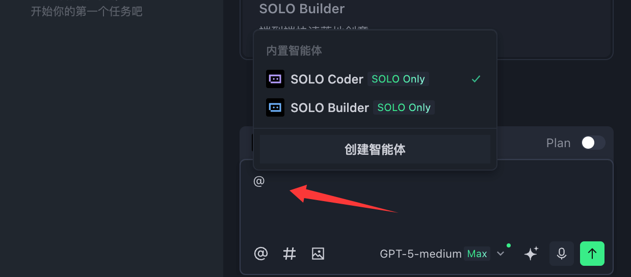 进入 SOLO 模式后,点击 AI 对话输入框左下角的 @ 符号,在智能体菜单中选择 SOLO Coder 即可。