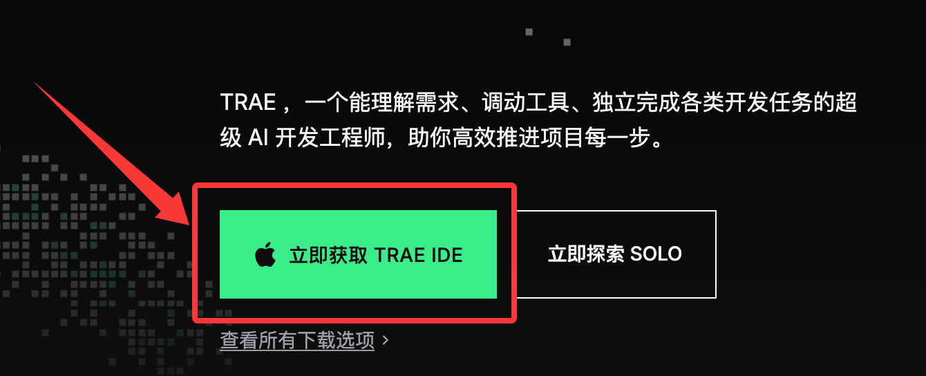 访问 Trae 官网 https://www.trae.cn/,默认情况,下载按钮会自动匹配我们的电脑系统,我们也可以找到适合自己电脑操作系统的 Trae 安装包,进行下载。