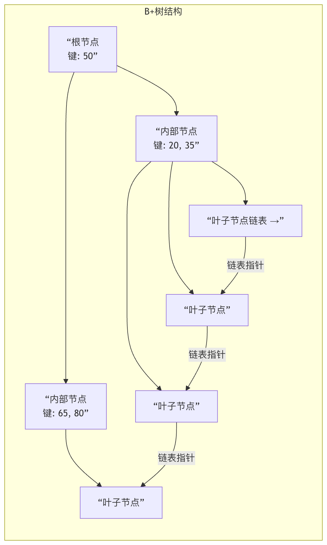 | 强大的范围查询 | 通过叶子节点的链表,可以高效地进行WHERE age BETWEEN 20 AND 30这类范围查询,而B树需要进行复杂的中序遍历。 |