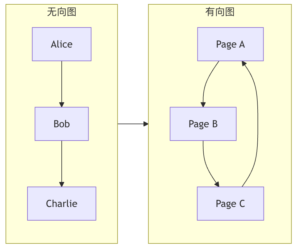 | 有向图 | 边有方向,A -> B 表示从 A 指向 B 的单向连接。 |