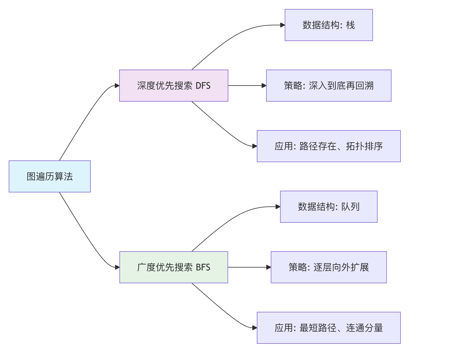 深度优先搜索(DFS)像"走迷宫"一样,选择一条路走到尽头,然后回溯,再走另一条路。它使用栈(或递归)来实现。