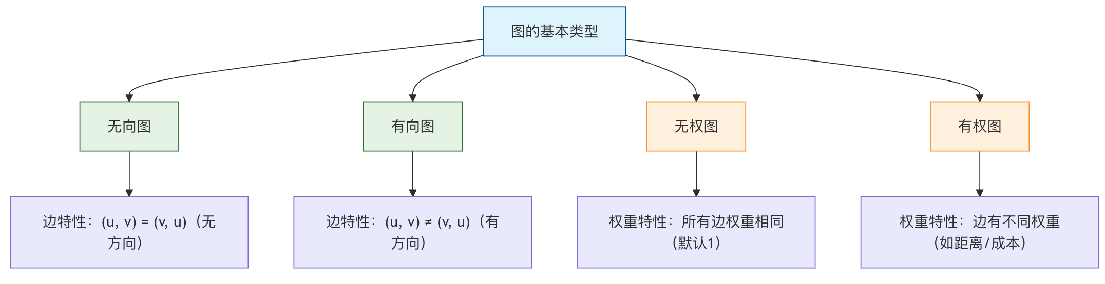 | 方向性 | 无向图 | 边没有方向 | 好友关系、道路网络 |