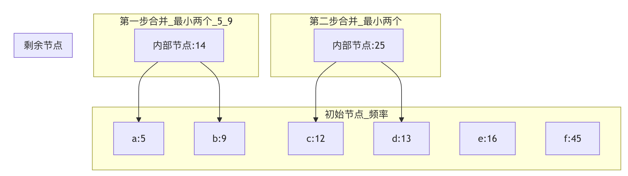 图解说明:算法始终从所有可用节点(初始为叶子节点,后续包括内部节点)中选出频率最小的两个进行合并,生成一个新的内部节点。此过程重复,直至形成一棵完整的二叉树。这棵树的叶子节点对应原始字符,从根到叶子的路径(左分支为 0,右分支为 1)即为该字符的霍夫曼编码。