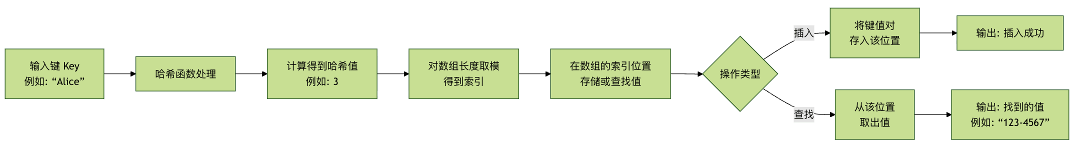 上图清晰地展示了哈希表的工作流程:无论是插入还是查找,都始于一个键,通过哈希函数计算出索引,然后直接对数组的该位置进行操作,从而实现了高速访问。