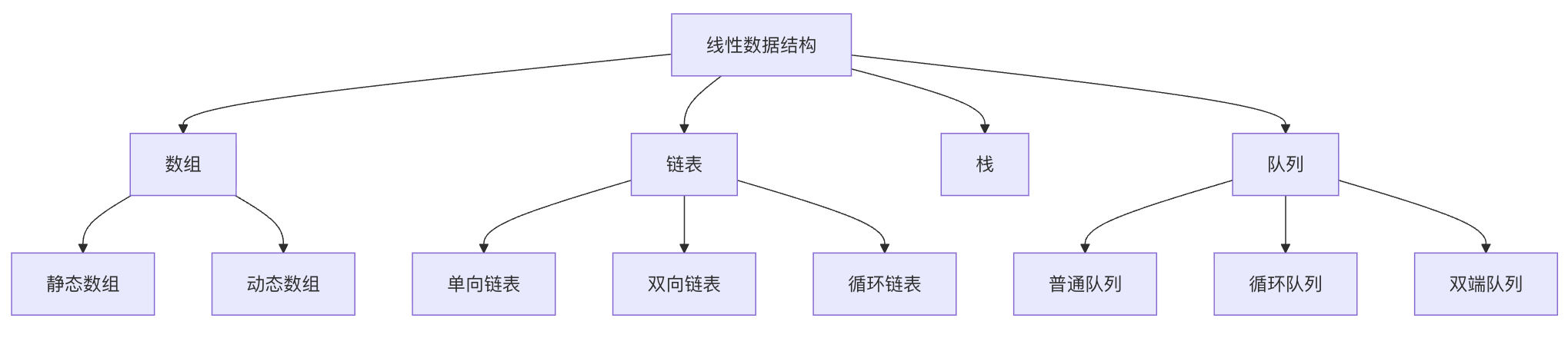 下图展示了线性数据结构的分类体系,每种结构都有其特定的应用场景和性能特点: