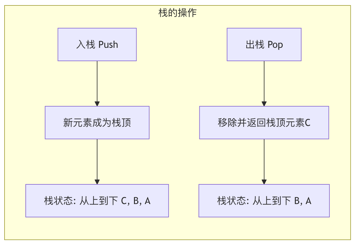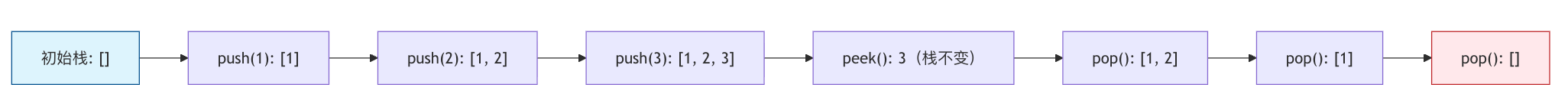 下图展示了栈的基本操作过程,栈遵循LIFO(后进先出)原则: