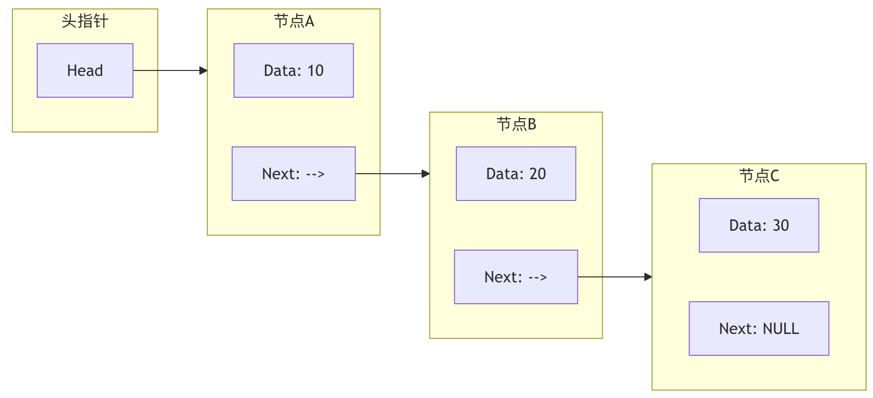 上图展示了一个 单向链表 的结构。头指针指向第一个节点,每个节点的 Next 指针指向下一个节点,最后一个节点的 Next 指向 NULL,表示链表结束。