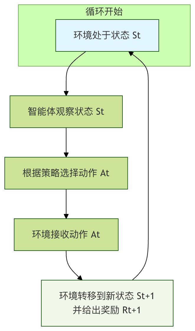 它们的关系是一个持续的循环:智能体观察环境 -> 做出动作 -> 环境反馈新的状态和奖励 -> 智能体再次观察...