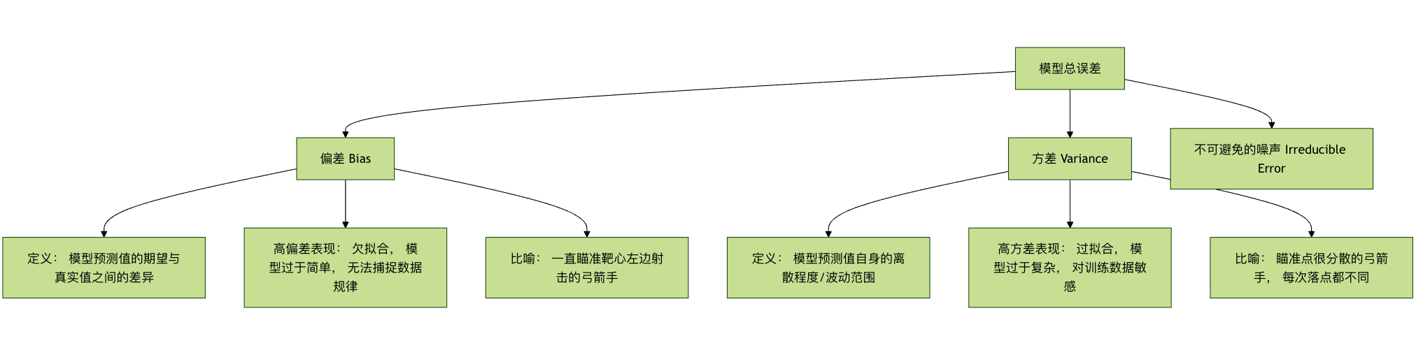 - 偏差 衡量的是模型本身的系统性错误。高偏差意味着模型太简单,连训练数据中的基本模式都没学好(欠拟合)。
