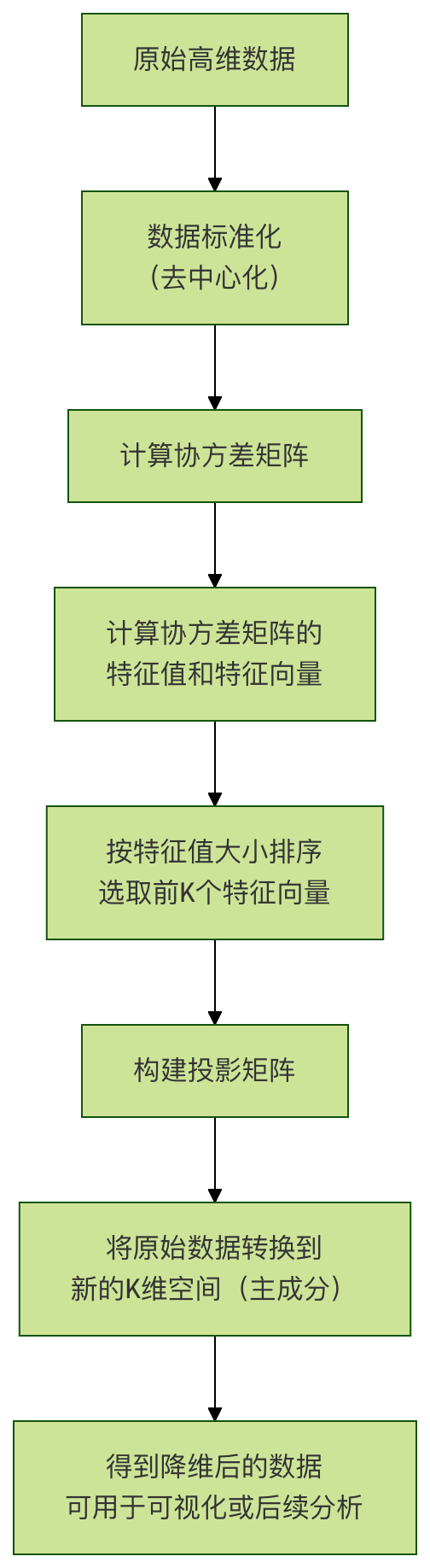 • 核心步骤:标准化 -> 计算协方差矩阵 -> 计算特征值与特征向量 -> 选择主成分 -> 数据投影。