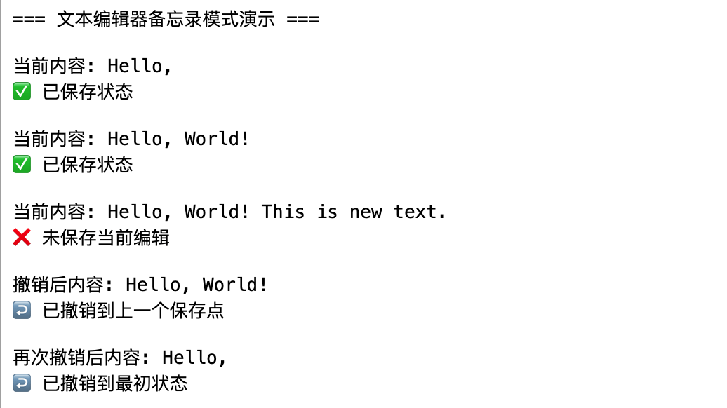 print("=== 文本编辑器备忘录模式演示 ===\n")