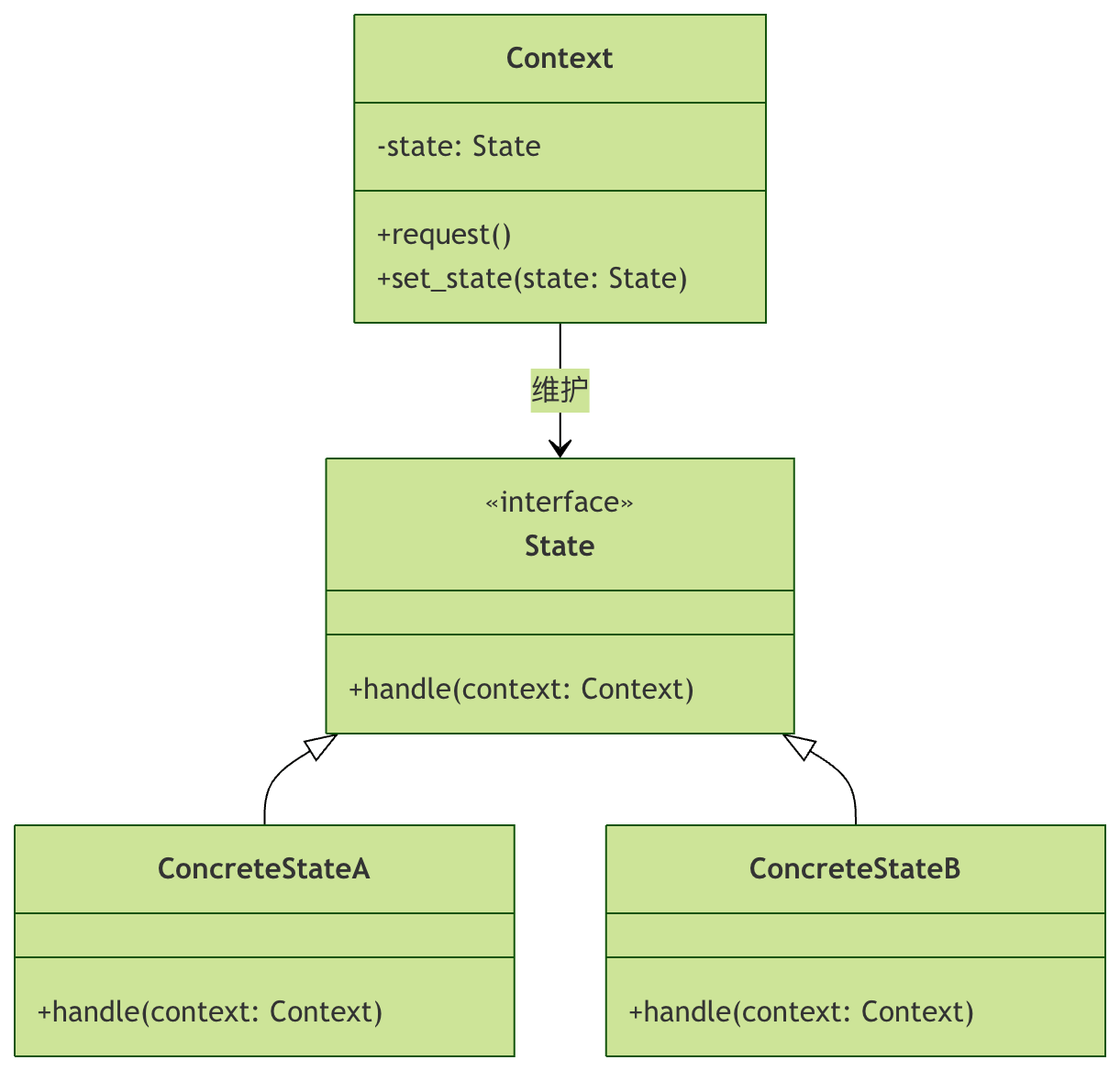 - ConcreteState(具体状态):实现 State 接口,每一个具体状态类实现一个与 Context 的状态相关的行为