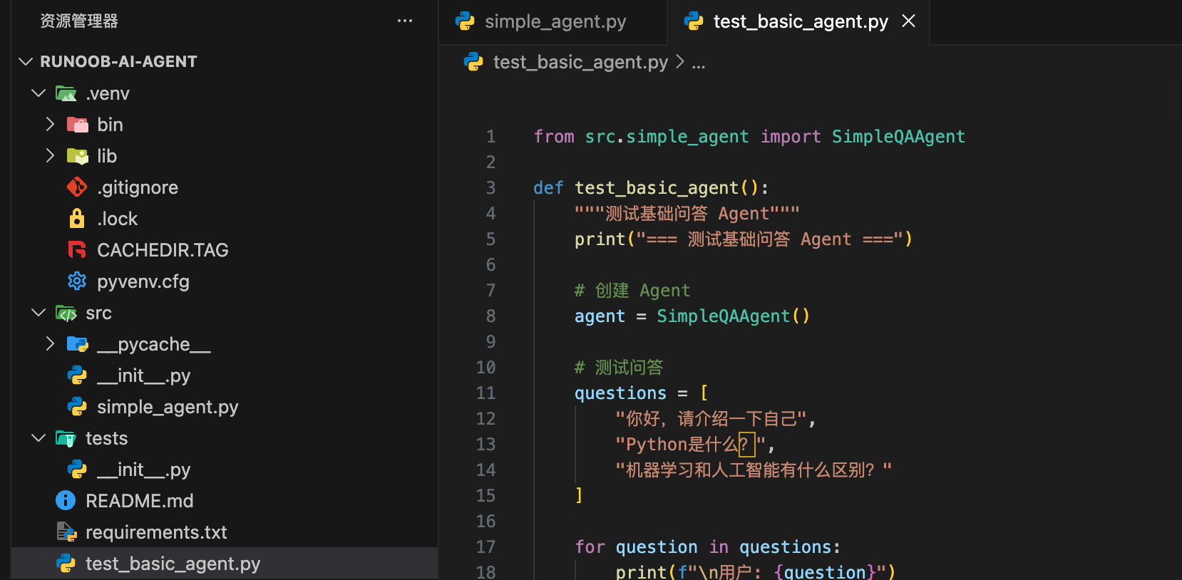 cd runoob-ai-agent # 创建名为 .venv 的虚拟环境(默认) uv venv # 激活环境(macOS/Linux) source .venv/bin/activate # 激活环境(Windows) .venv\Scripts\activate