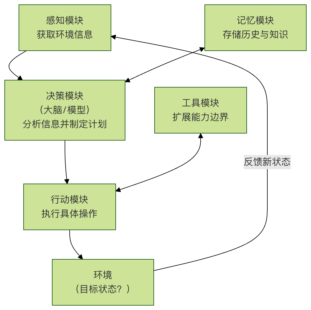 一个功能完整的 AI Agent 通常模仿人类的认知和行动循环,包含以下几个关键模块: