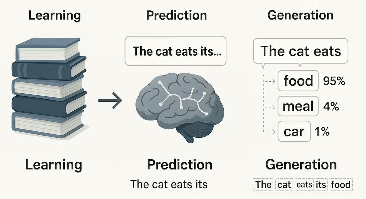 - 学习阶段(训练):它阅读了互联网上几乎所有公开的文本——书籍、文章、网页、代码等等(数据量可达万亿单词级别)。在这个过程中,它不是在背诵,而是在学习一个极其复杂的语言规律。