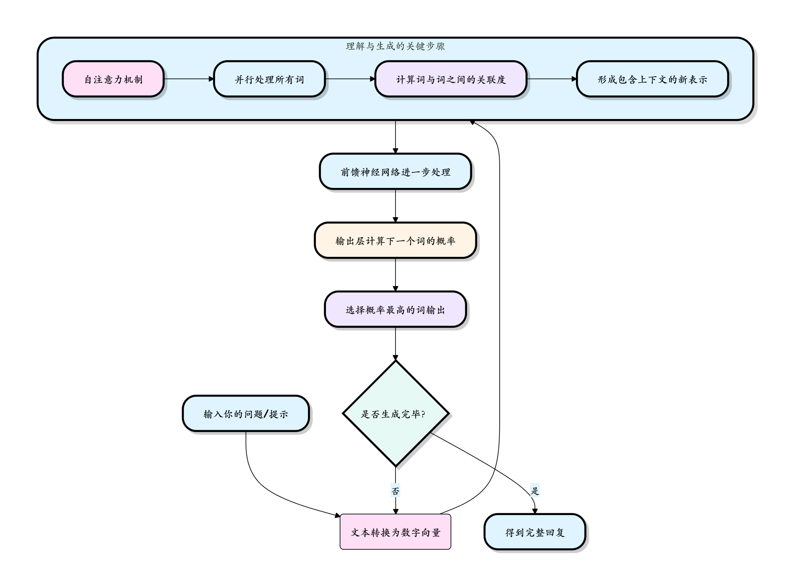 生成与循环:模型基于当前对所有词的理解,计算出一个概率分布,预测下一个最可能出现的词是什么。选中并输出这个词后,把这个词作为新的输入,重复整个过程,直到生成完整的回答。