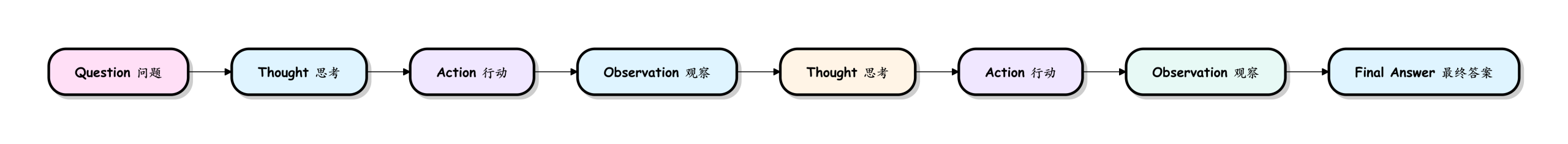 AI Agent 通常遵循一个名为 ReAct = Reasoning(推理)+ Acting(行动) 的经典思维范式,这是一个持续的 思考-行动 循环,直到任务完成为止。