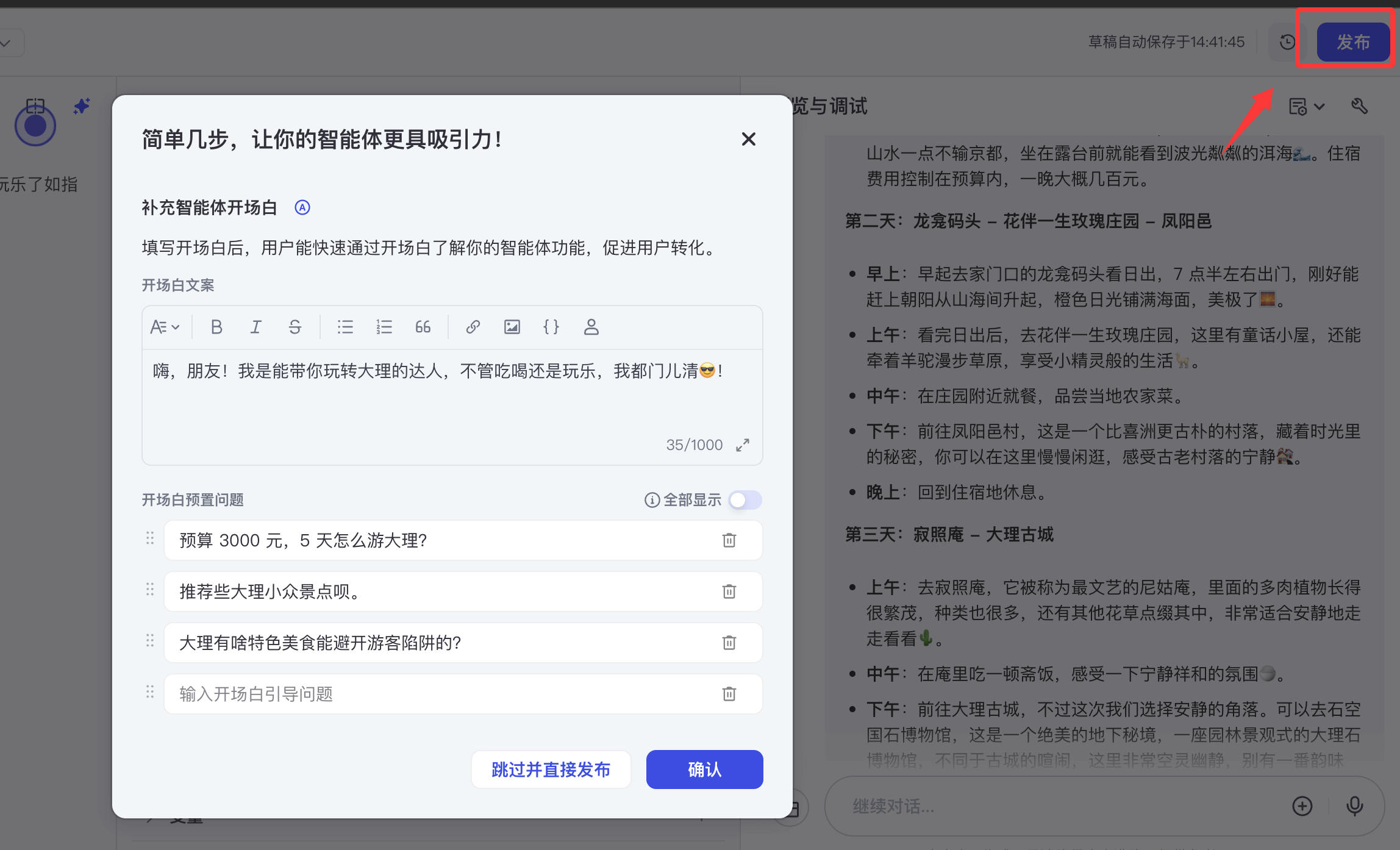帮用户规划去大理的旅行行程。 - 点击 "确认",进入编辑页面。