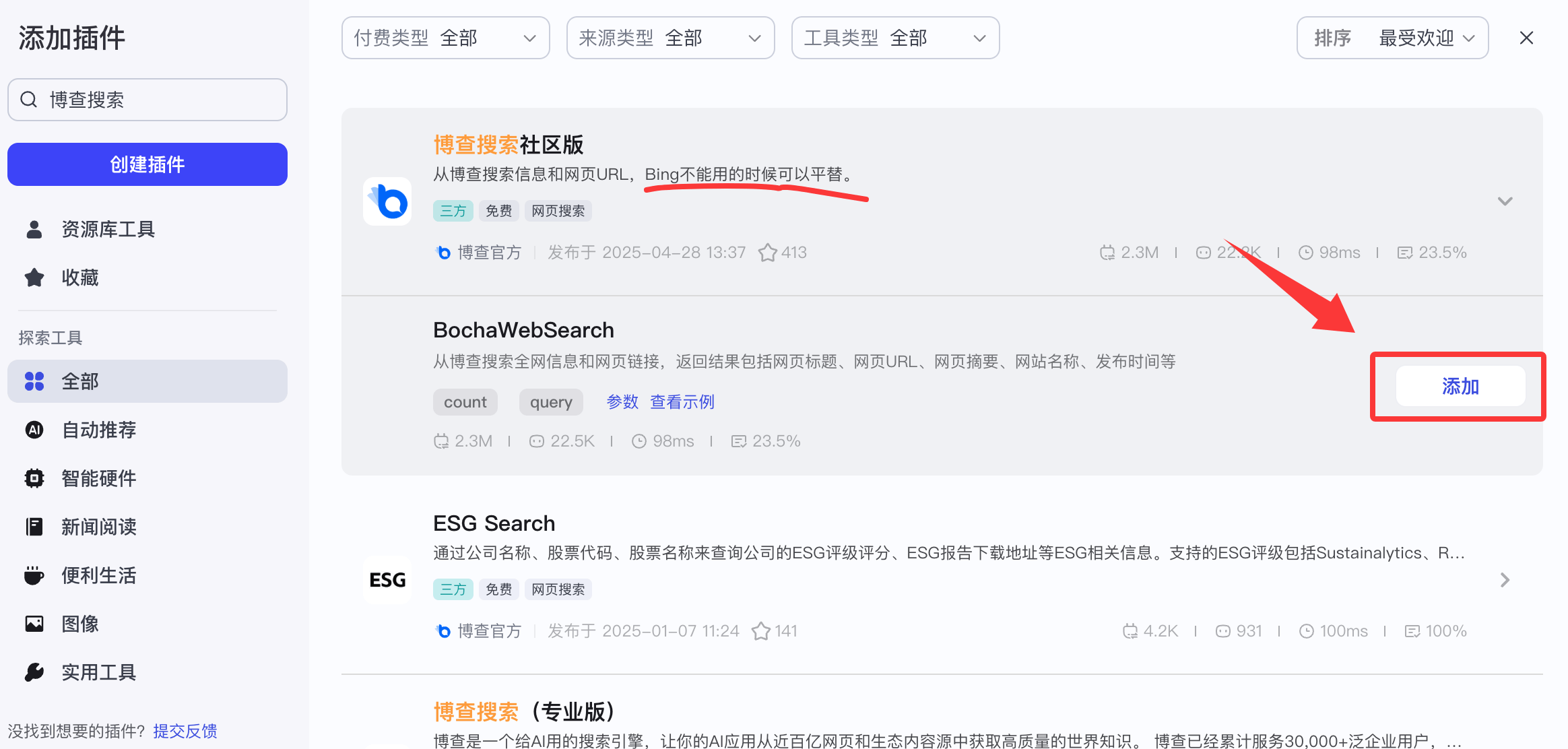 博查搜索(可以调用 bing 搜索) 或Google,点击 "添加"。 为什么要加这个?让它能联网查最新的天气和门票价格。