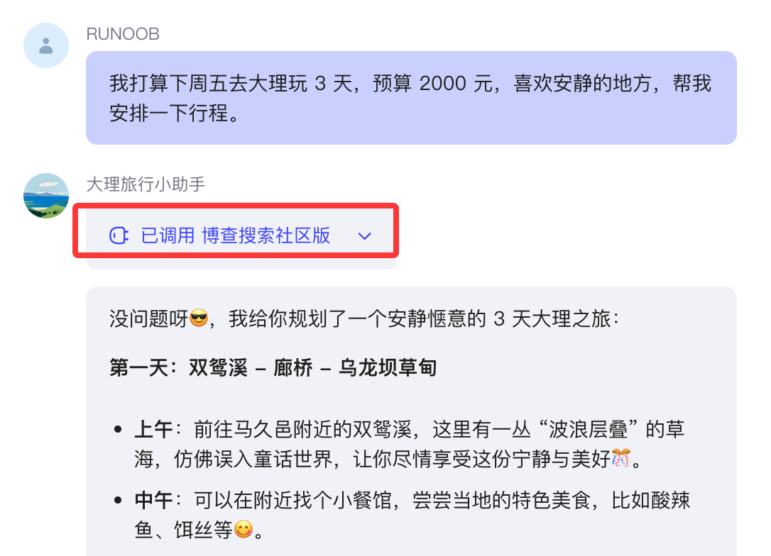 你会看到它不会马上回答,而是显示 "正在使用 博查搜索社区…" 或者 "正在使用 天气…"。这就是 Agent 在思考和行动!
