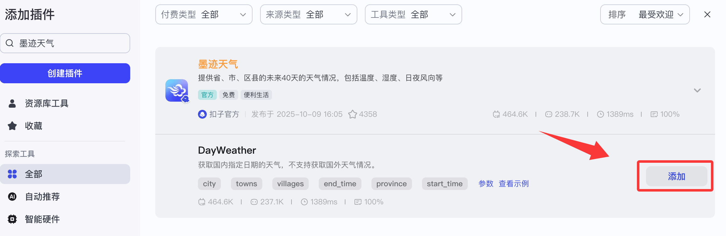 墨迹天气(或者任意天气插件),点击 "添加"。