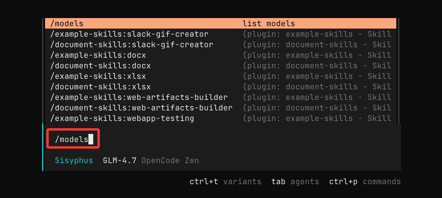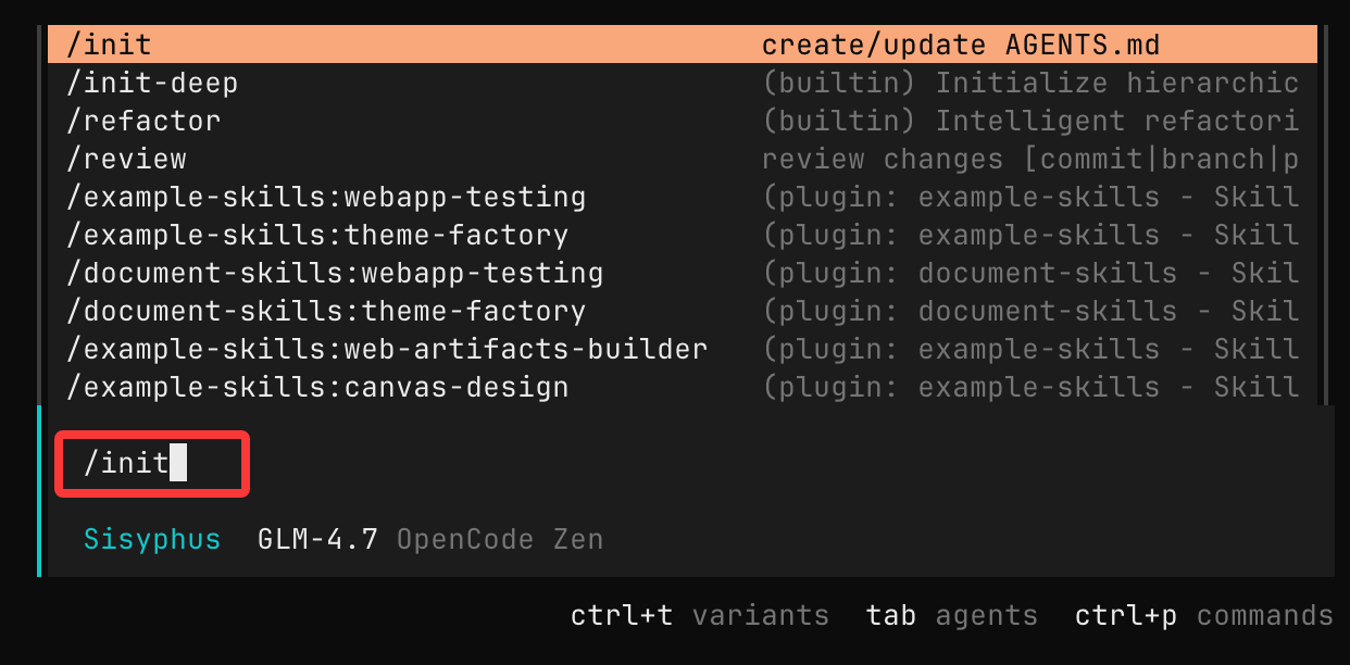 在 OpenCode 界面中,运行:
