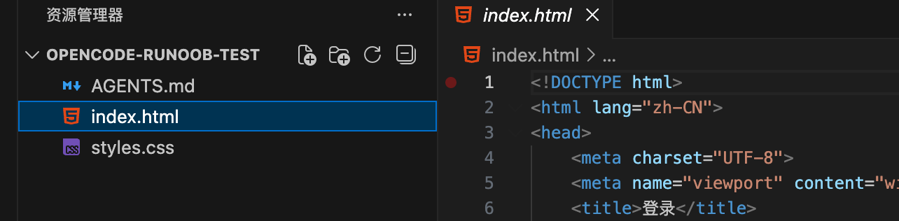 例如,我们创建目录 opencode-runoob-test: