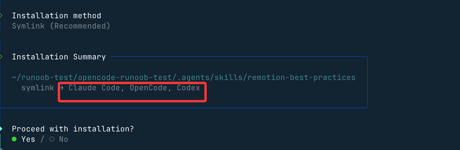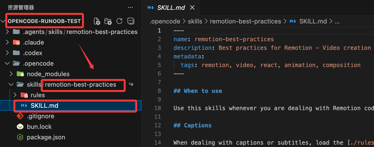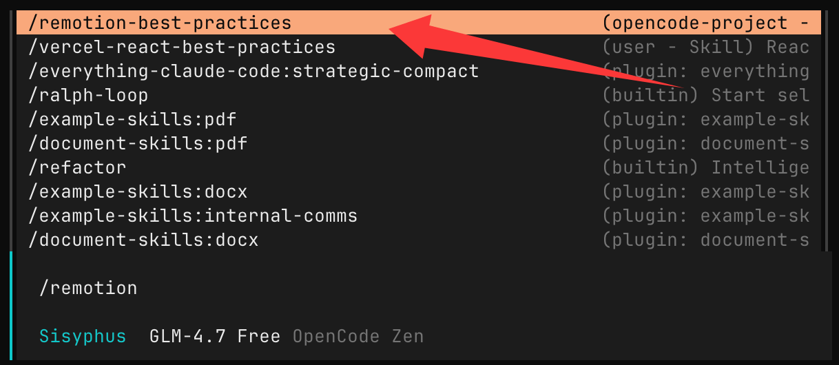 我们也可以打开 OpenCode,输入 /remotion 就可以看到这个 skill: