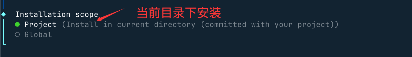 接下来这里选择当前目录也就是我们之前创建的 opencode-runoob-test,另一个选项 Global 是全局安装: