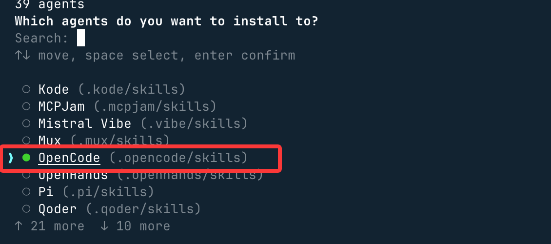 安装过程,可以勾选我们需要的环境,比如 OpenCode: