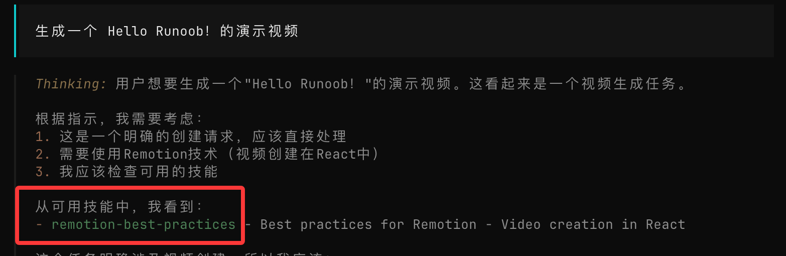 接下来使用 remotion-best-practices 这个 skill 来演示。