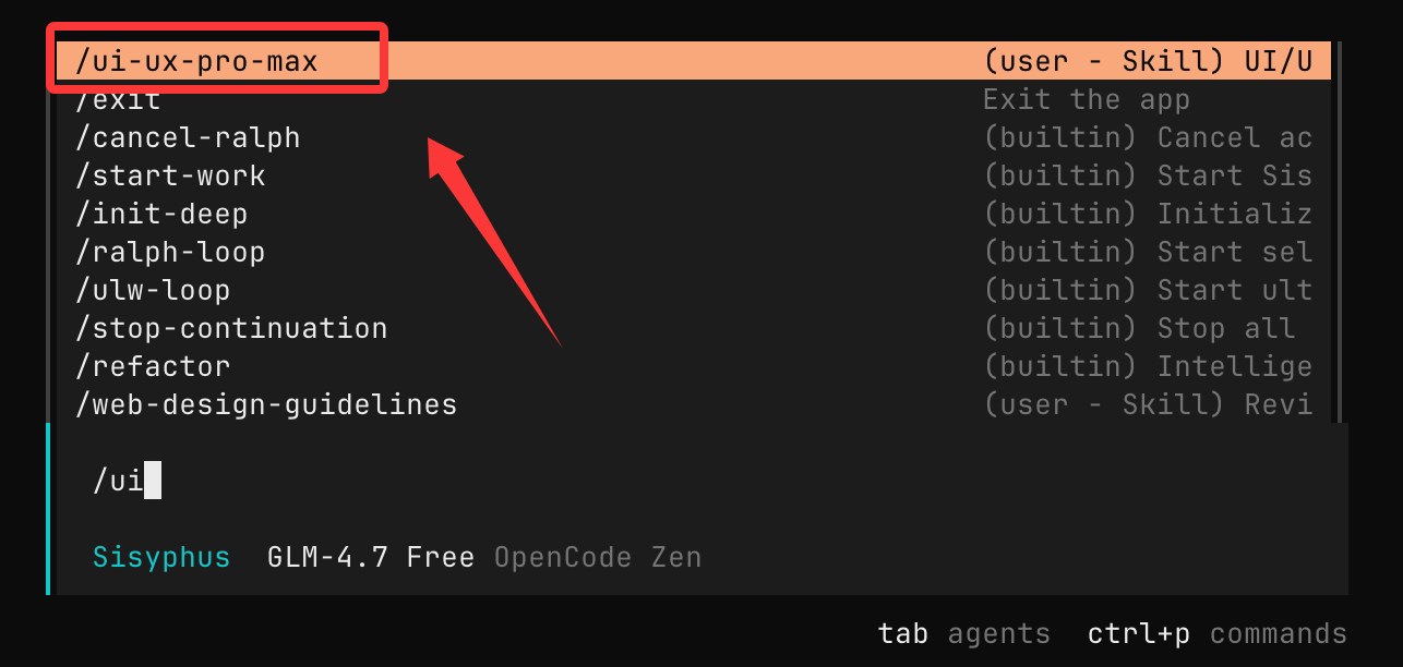 使用 opencode 命令打开 OpenCode,输入 /ui 就可以看到安装的 skill:
