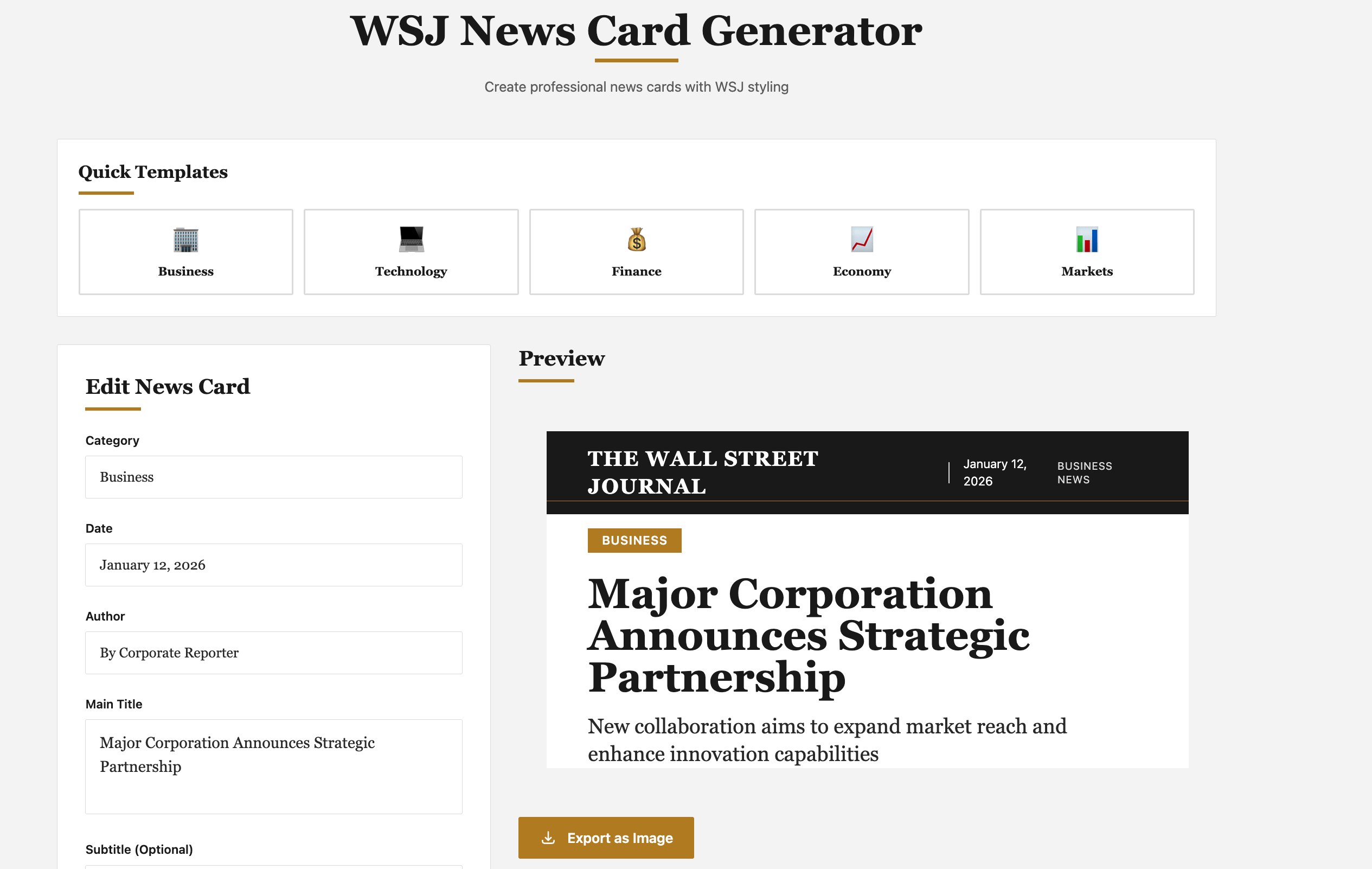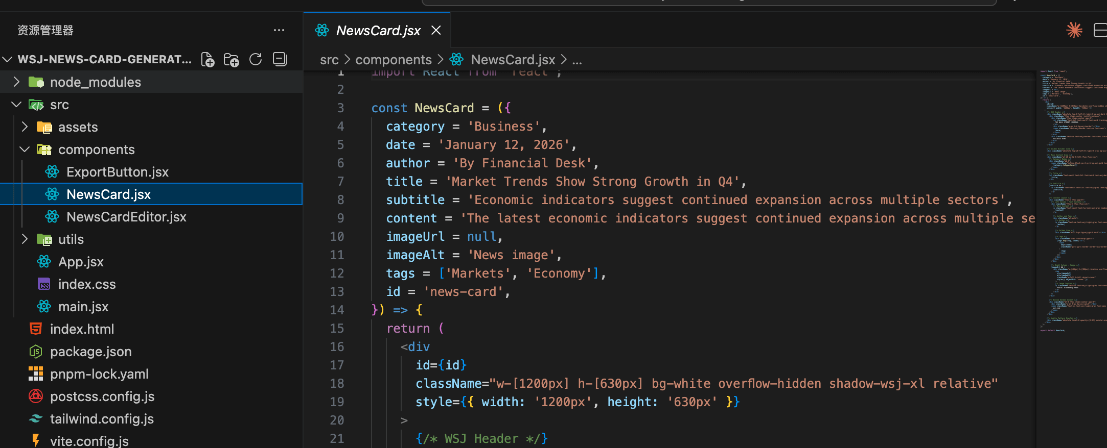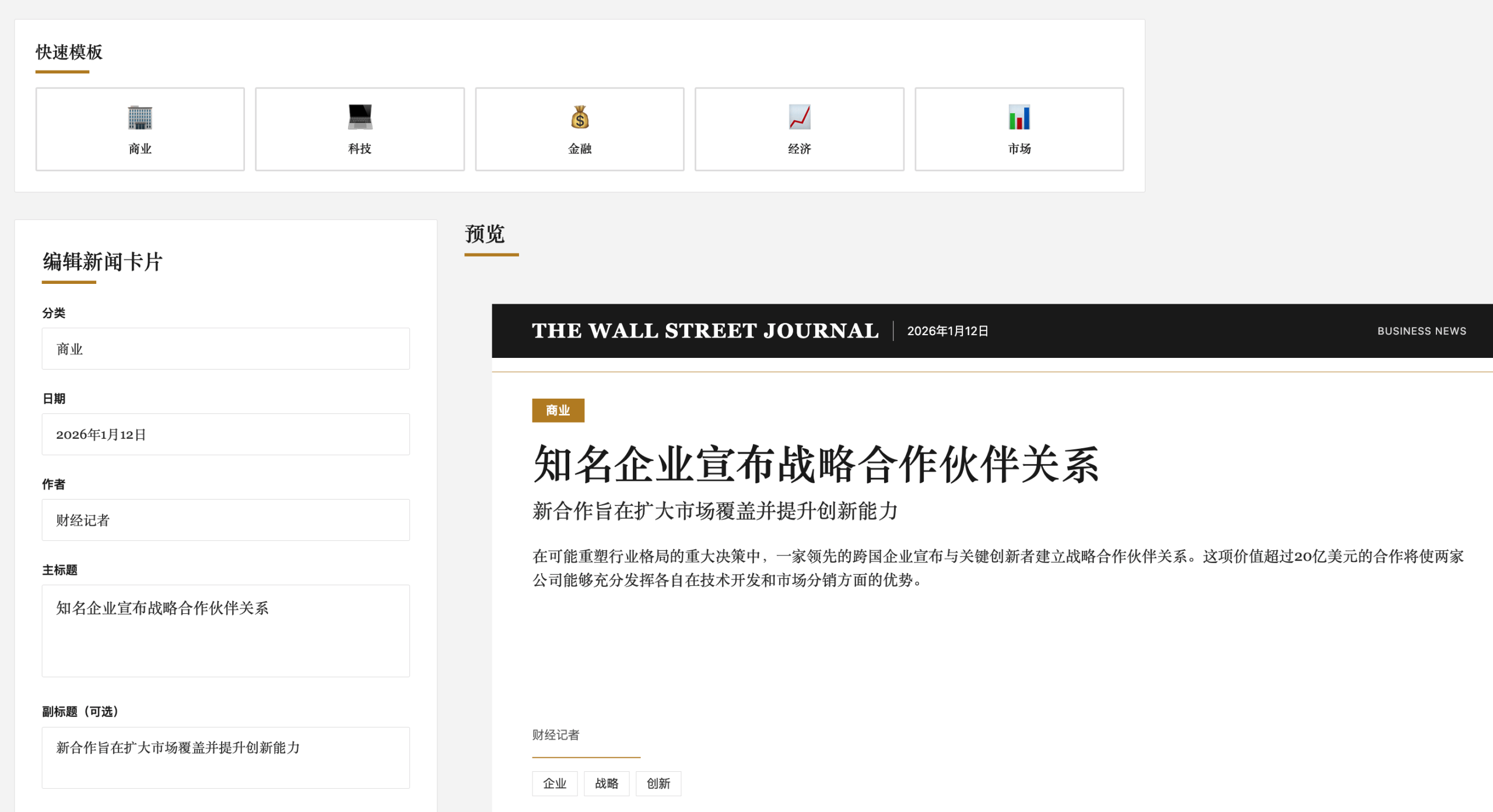 目标: 使用 React + Tailwind CSS 创建一个华尔街日报风格的新闻卡片生成器