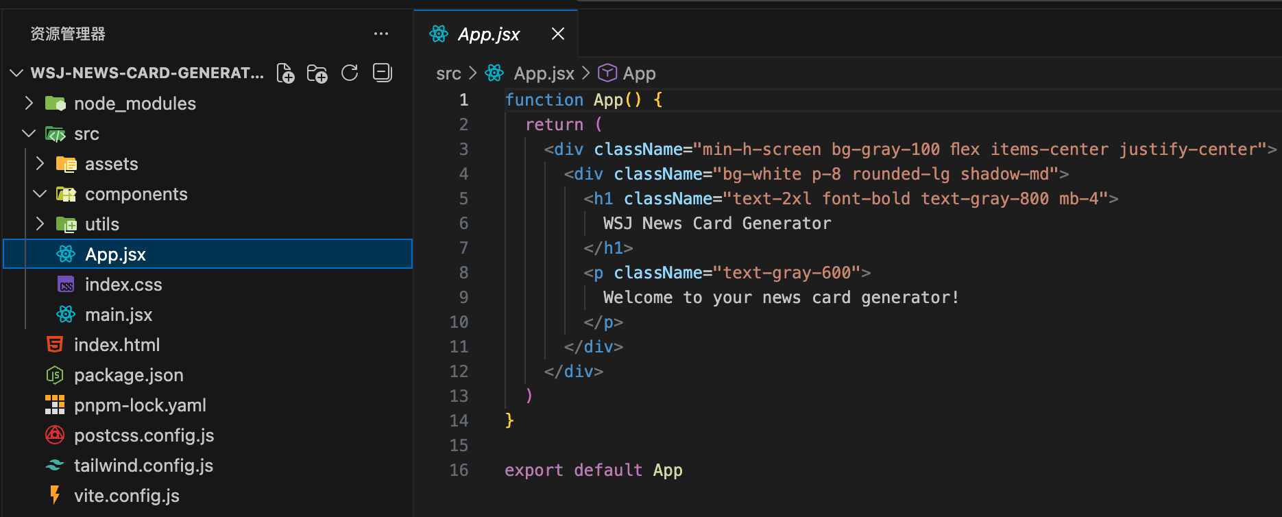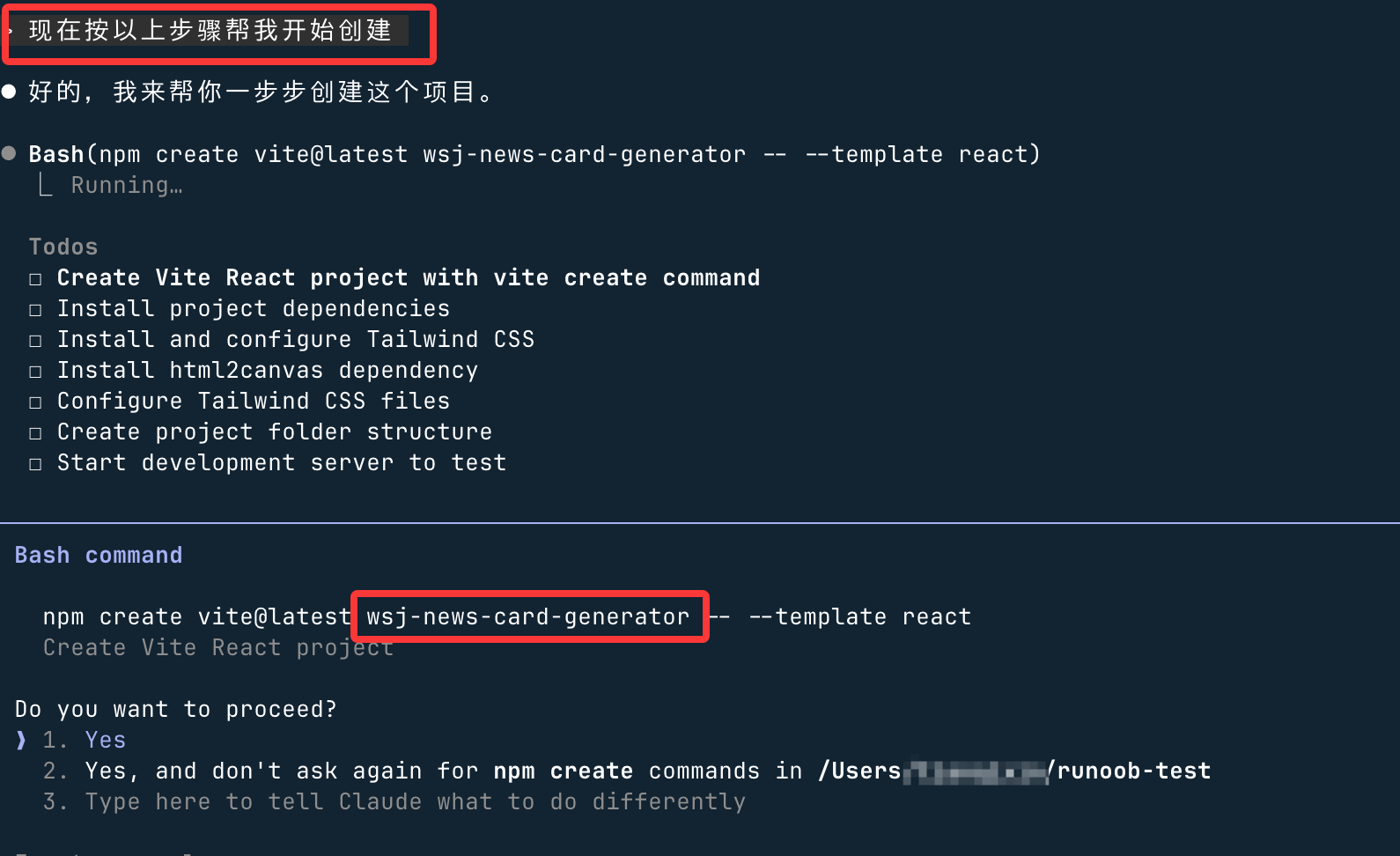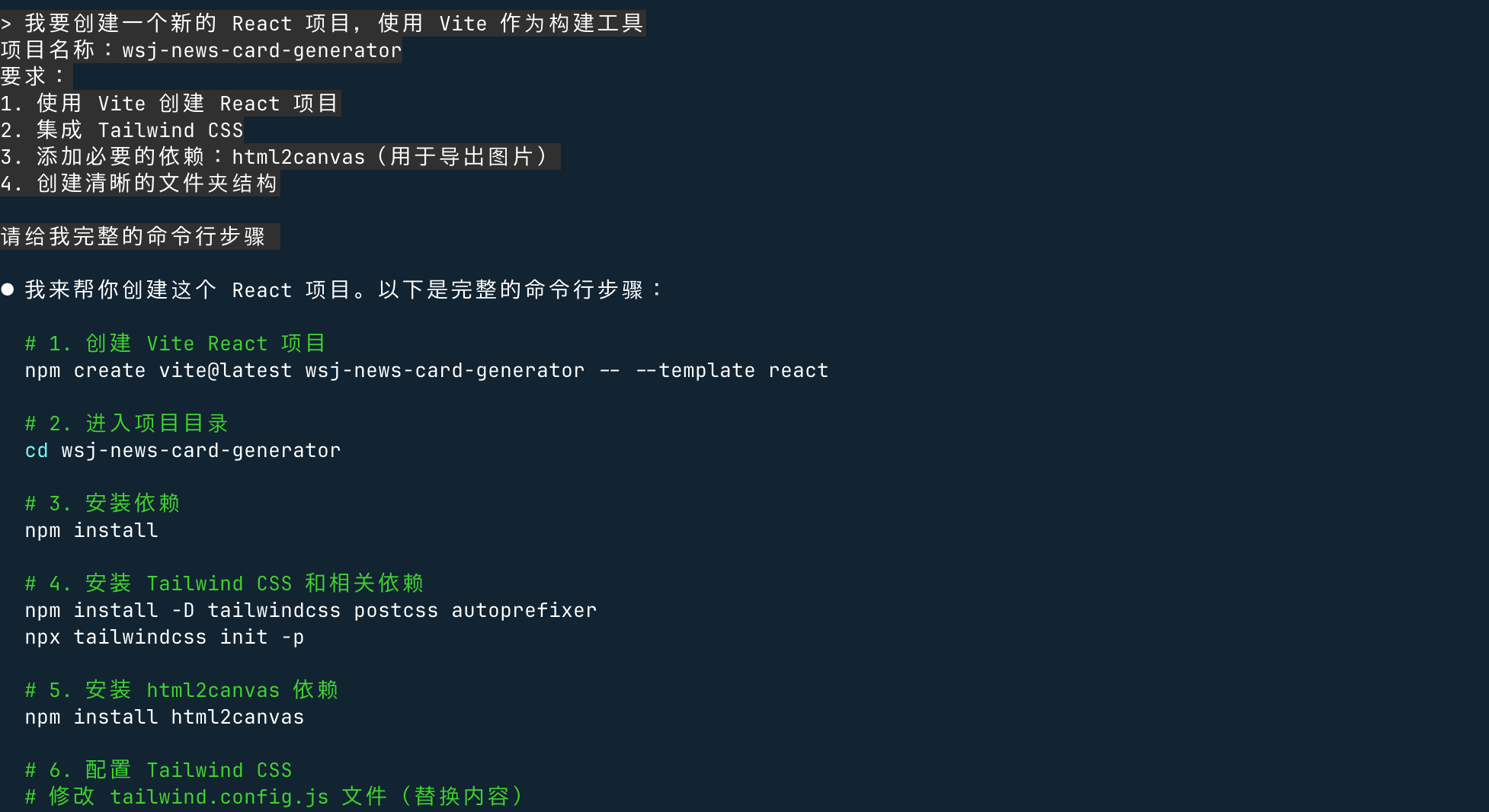 我要创建一个新的 React 项目,使用 Vite 作为构建工具 项目名称:wsj-news-card-generator 要求: 1. 使用 Vite 创建 React 项目 2. 集成 Tailwind CSS 3. 添加必要的依赖:html2canvas(用于导出图片) 4. 创建清晰的文件夹结构 请给我完整的命令行步骤