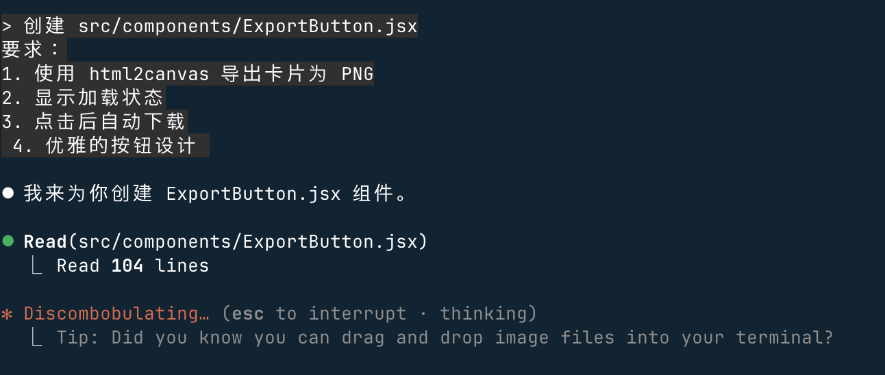 创建 src/components/ExportButton.jsx 要求: 1. 使用 html2canvas 导出卡片为 PNG 2. 显示加载状态 3. 点击后自动下载 4. 优雅的按钮设计