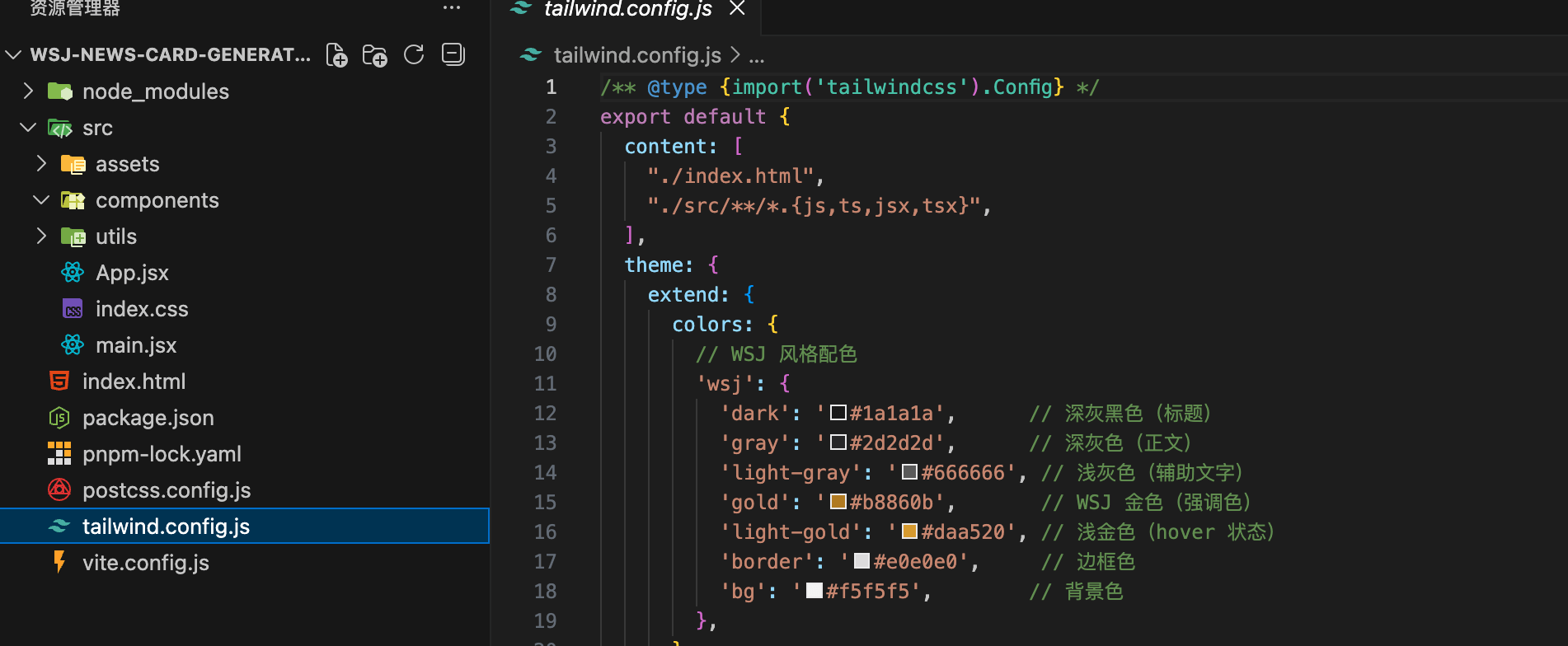 现在帮我配置 Tailwind CSS 修改 tailwind.config.js,添加自定义配置: 1. 添加 WSJ 风格的颜色(深灰色文字、金色强调色) 2. 添加衬线字体(Playfair Display, Merriweather) 3. 扩展阴影效果