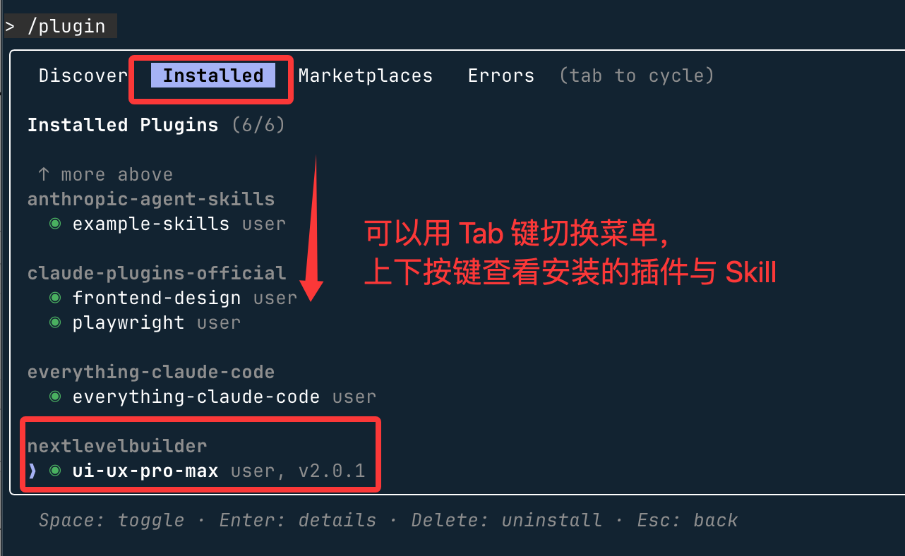 我们可以使用 /plugin 命令查看已经安装的创建: