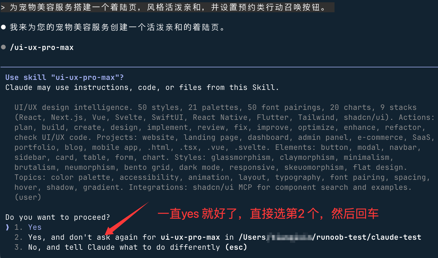 会提示是否使用我们安装的 skill 来设计,一路回车就好了: