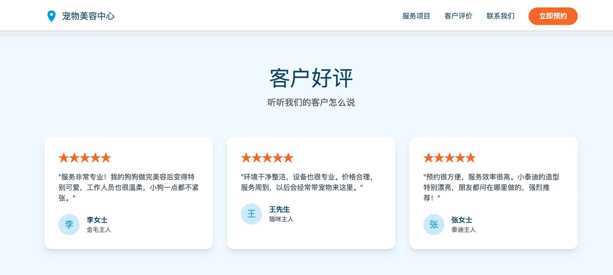 为宠物美容服务搭建一个着陆页,风格活泼亲和,并设置预约类行动召唤按钮。