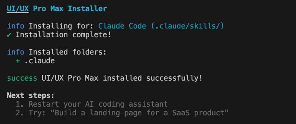 npm install -g uipro-cli # 进入你的项目目录 cd /path/to/your/project # 为对应 AI 助手安装 uipro init --ai claude # Claude Code uipro init --ai cursor # Cursor uipro init --ai windsurf # Windsurf uipro init --ai antigravity # Antigravity (.agent + .shared) uipro init --ai copilot # GitHub Copilot uipro init --ai kiro # Kiro uipro init --ai codex # Codex CLI uipro init --ai qoder # Qoder uipro init --ai roocode # Roo Code uipro init --ai gemini # Gemini CLI uipro init --ai trae # Trae uipro init --ai all # 所有助手