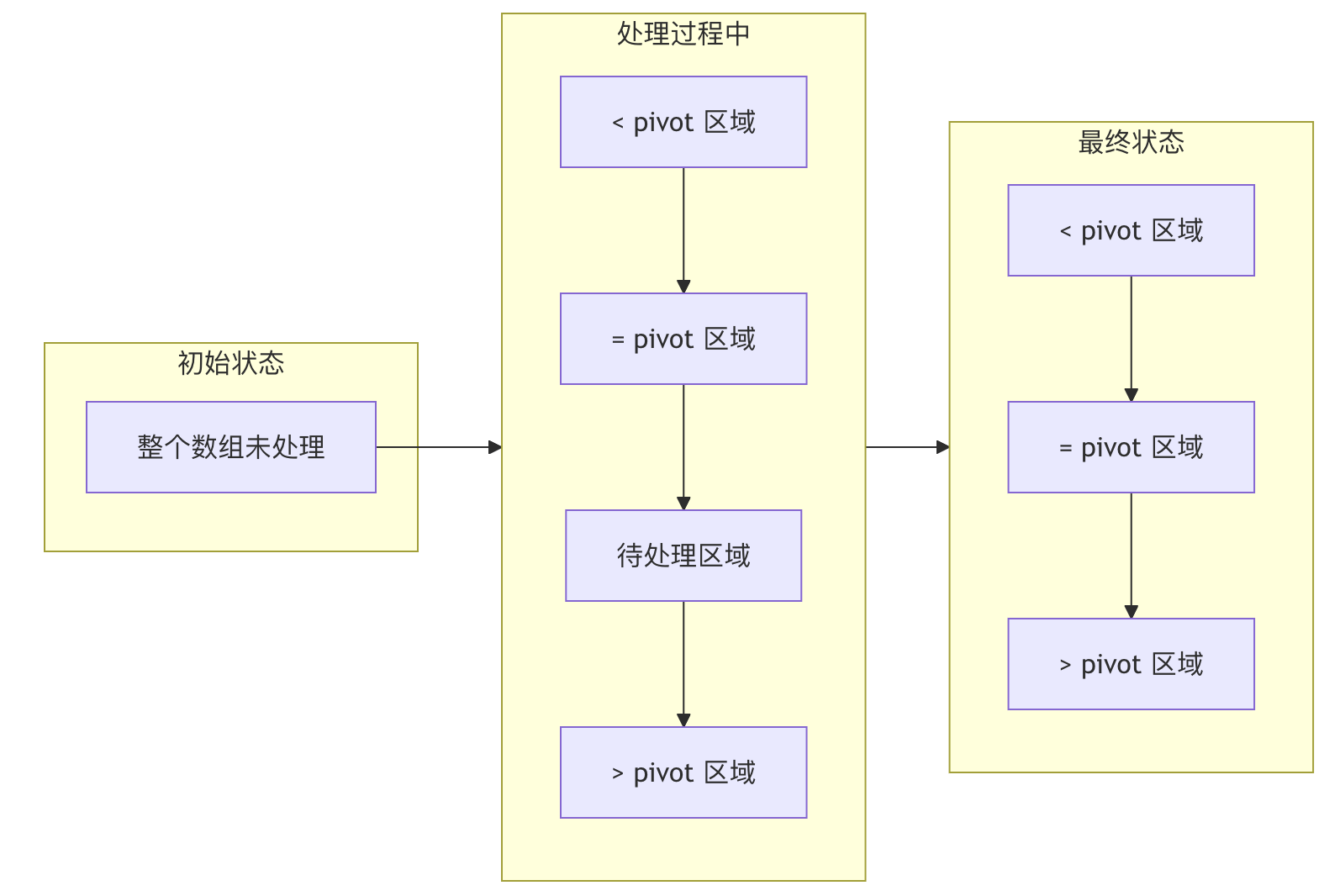 图说明:算法维护三个指针(lt, i, gt)将数组分为四个区域,随着处理进行,待处理区域逐渐缩小,最终形成三个明确的分区。