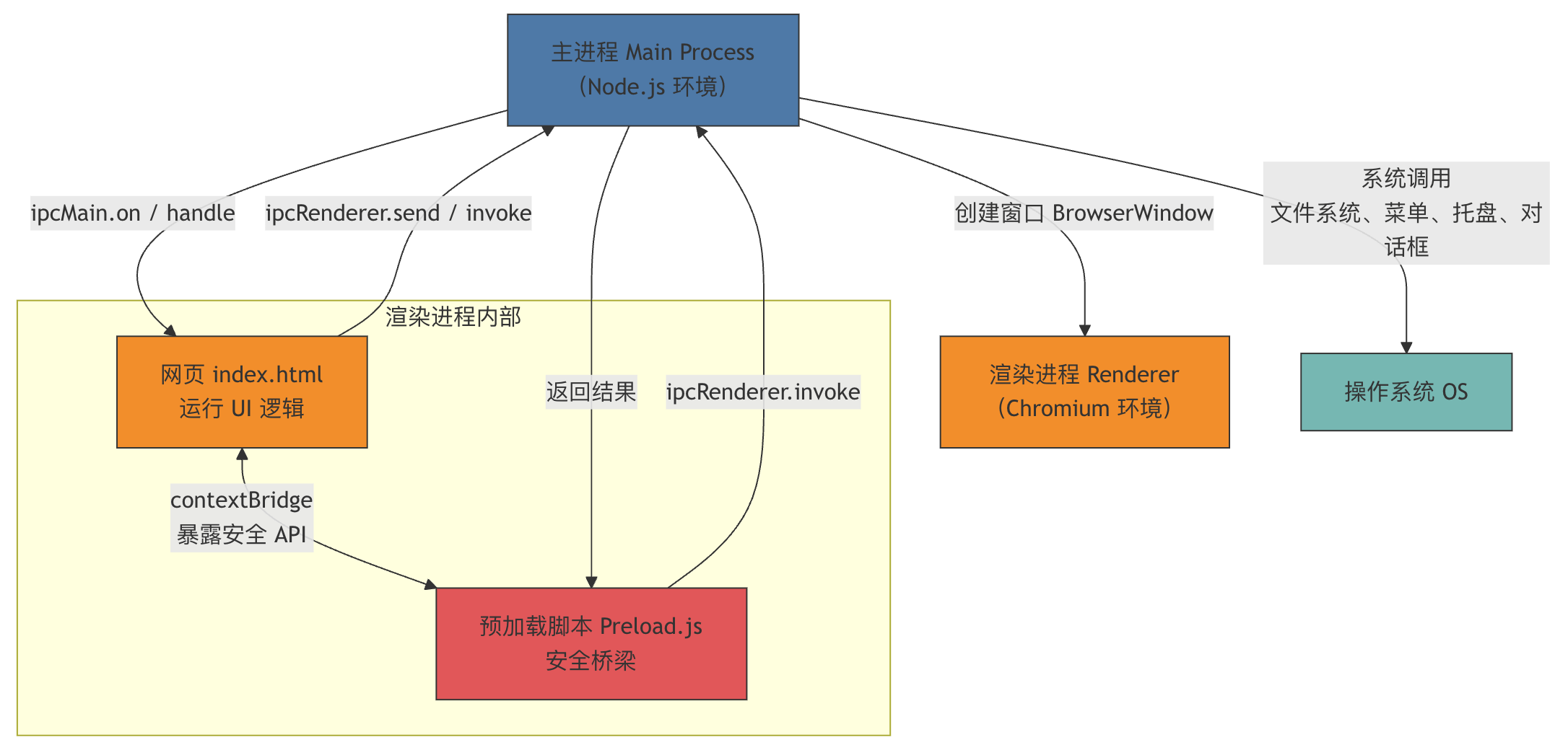 下面是 Electron 核心架构,展示了主进程、渲染进程、IPC 通信、以及 Preload 的关系。