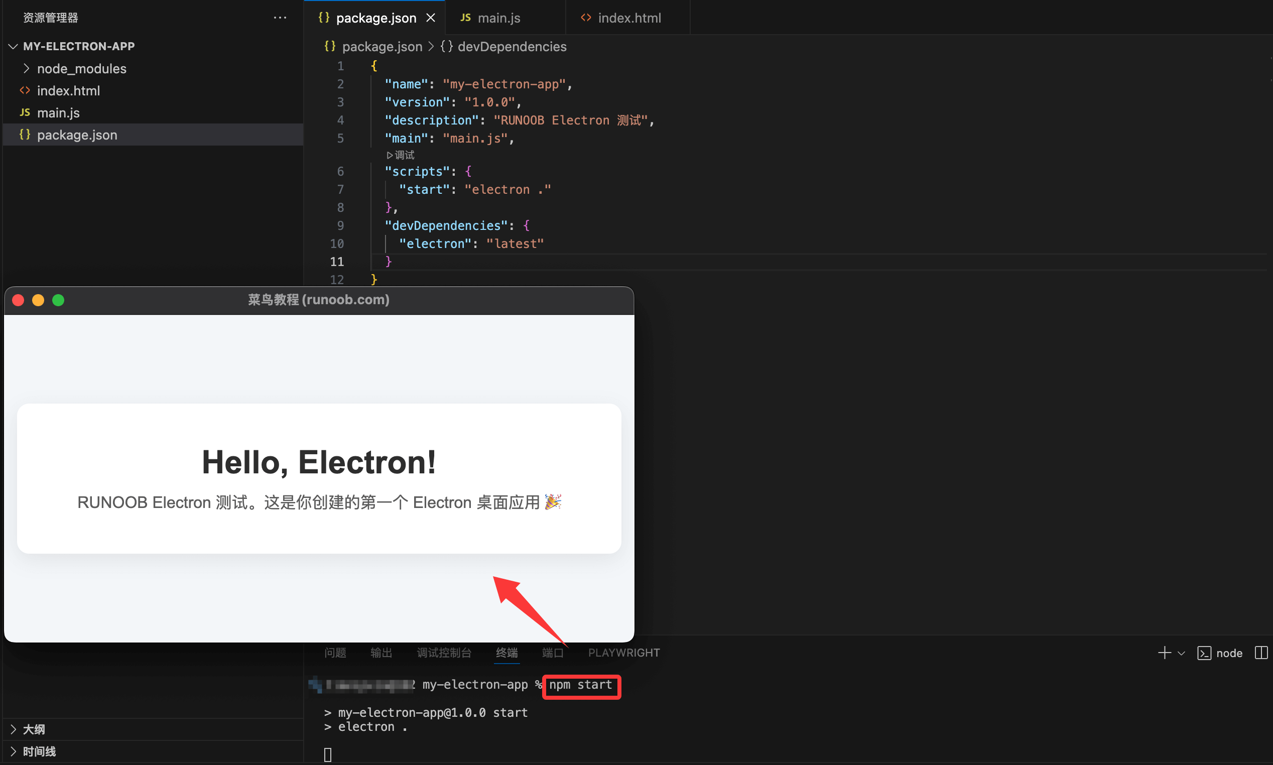 { "name": "my-electron-app", "version": "1.0.0", "description": "RUNOOB Electron 测试", "main": "main.js", "scripts": { "start": "electron ." }, "devDependencies": { "electron": "latest" } }
