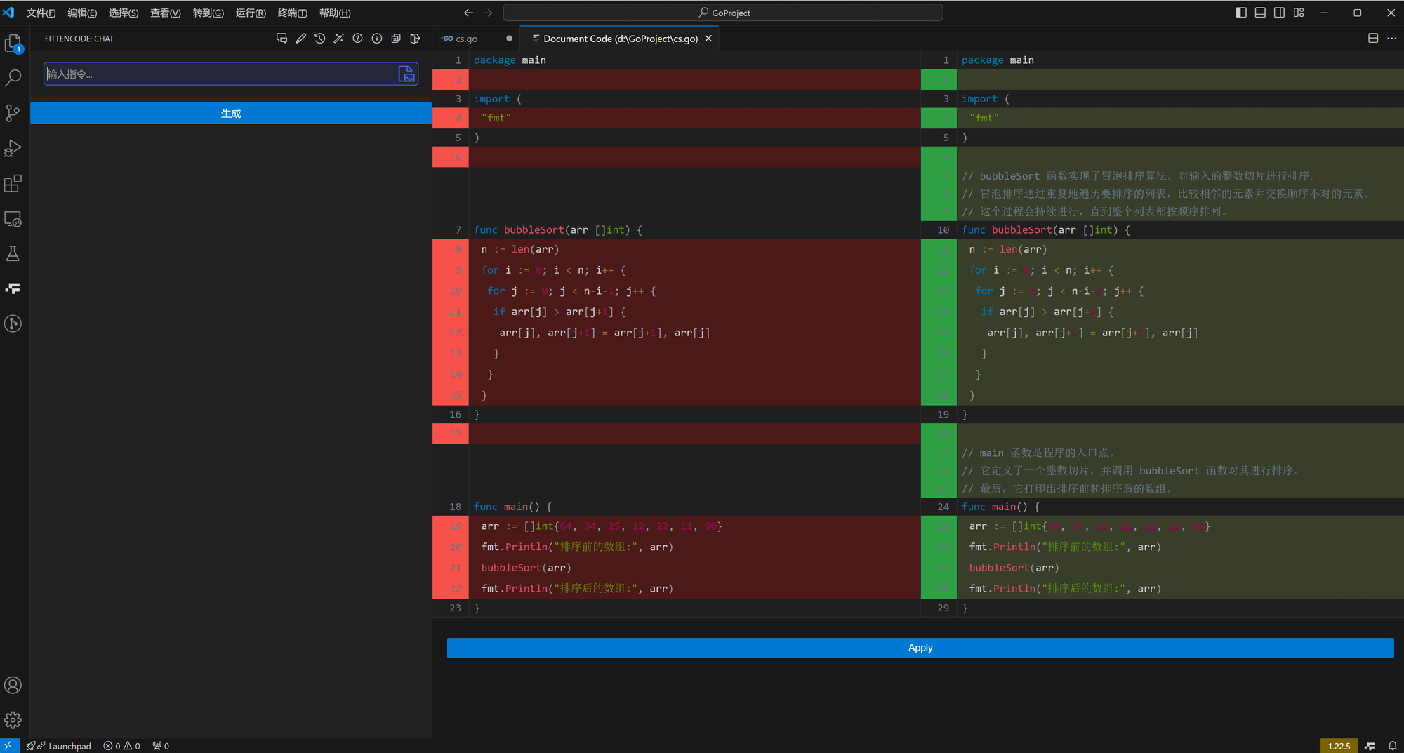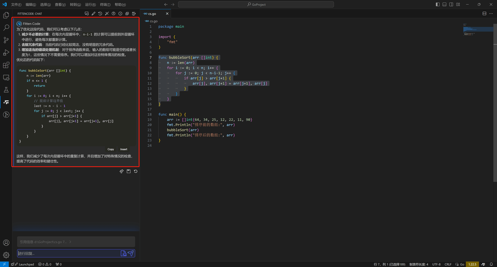 当用户选中文件中的代码段再进行对话时,Fitten Code 会自动引用用户所选中的代码段,此时可直接针对该代码段进行问询等操作: