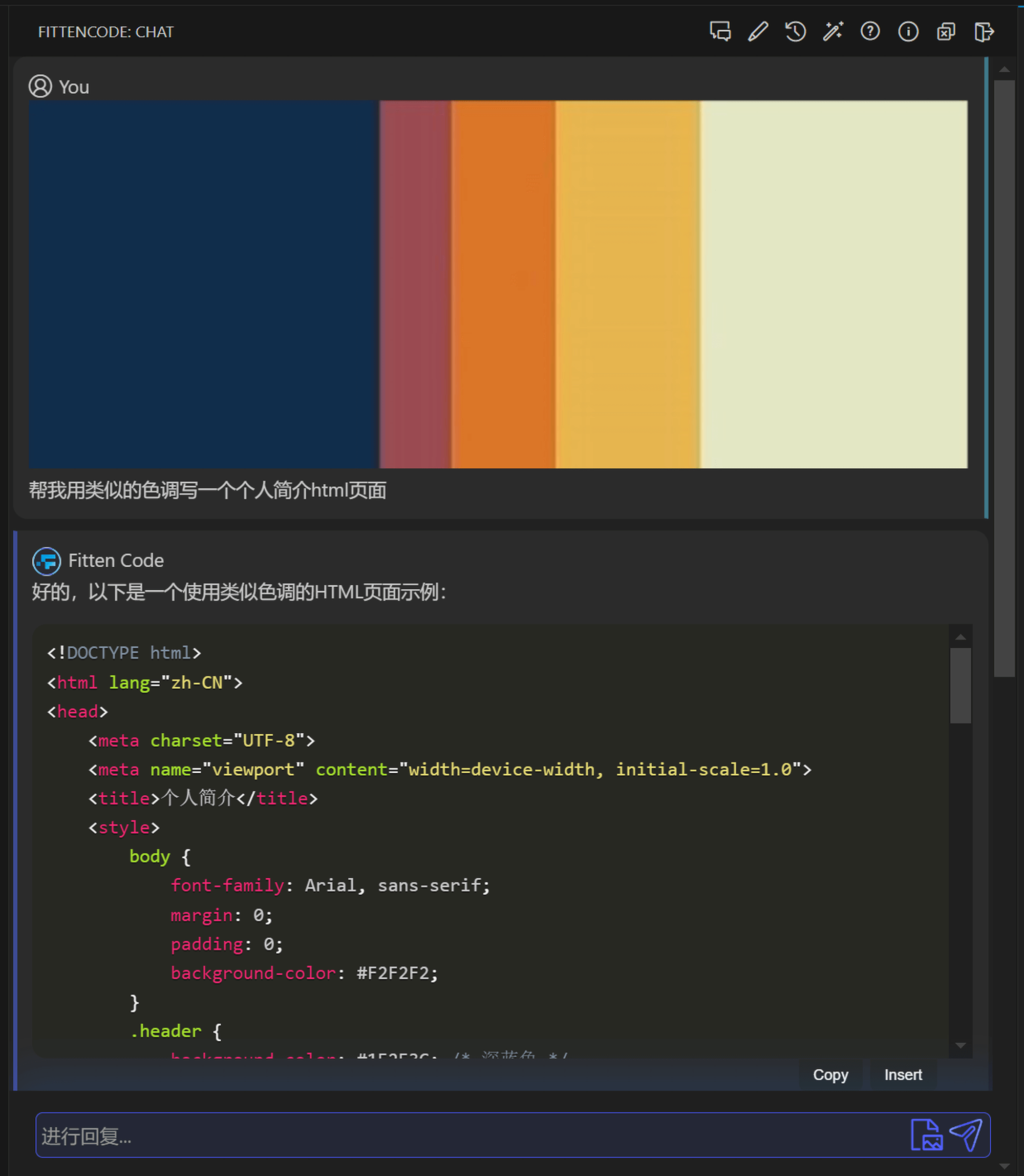 Fitten Code 生成的个人介绍网页效果,可以看到该网页色调与输入的图像色调一致。