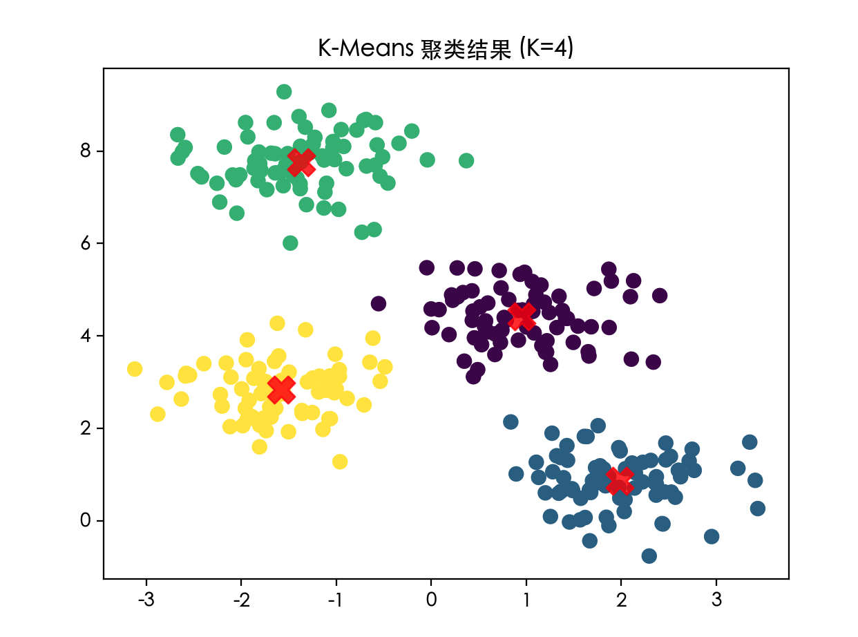 make_blobs:生成用于聚类的模拟数据集,centers=4表示数据围绕 4 个中心点生成。KMeans(n_clusters=4):创建 K-Means 模型实例,指定簇数 K 为 4。n_init='auto'是运行算法的次数,取最佳结果。fit_predict(X):核心方法,在数据X上拟合模型并返回每个样本的簇索引(0, 1, 2, 3)。cluster_centers_:属性,存储训练后得到的 K 个质心的坐标。