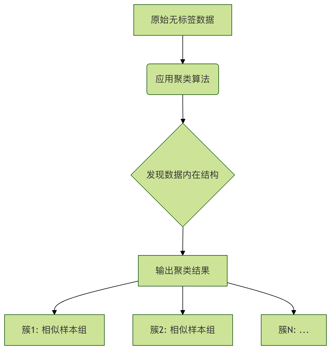- 无监督学习:就像让机器自己去探索和发现。我们只提供问题(特征数据),不提供答案(标签)。算法的任务是自行从数据中找出模式、结构或关系。聚类就是其中最核心的技术之一。