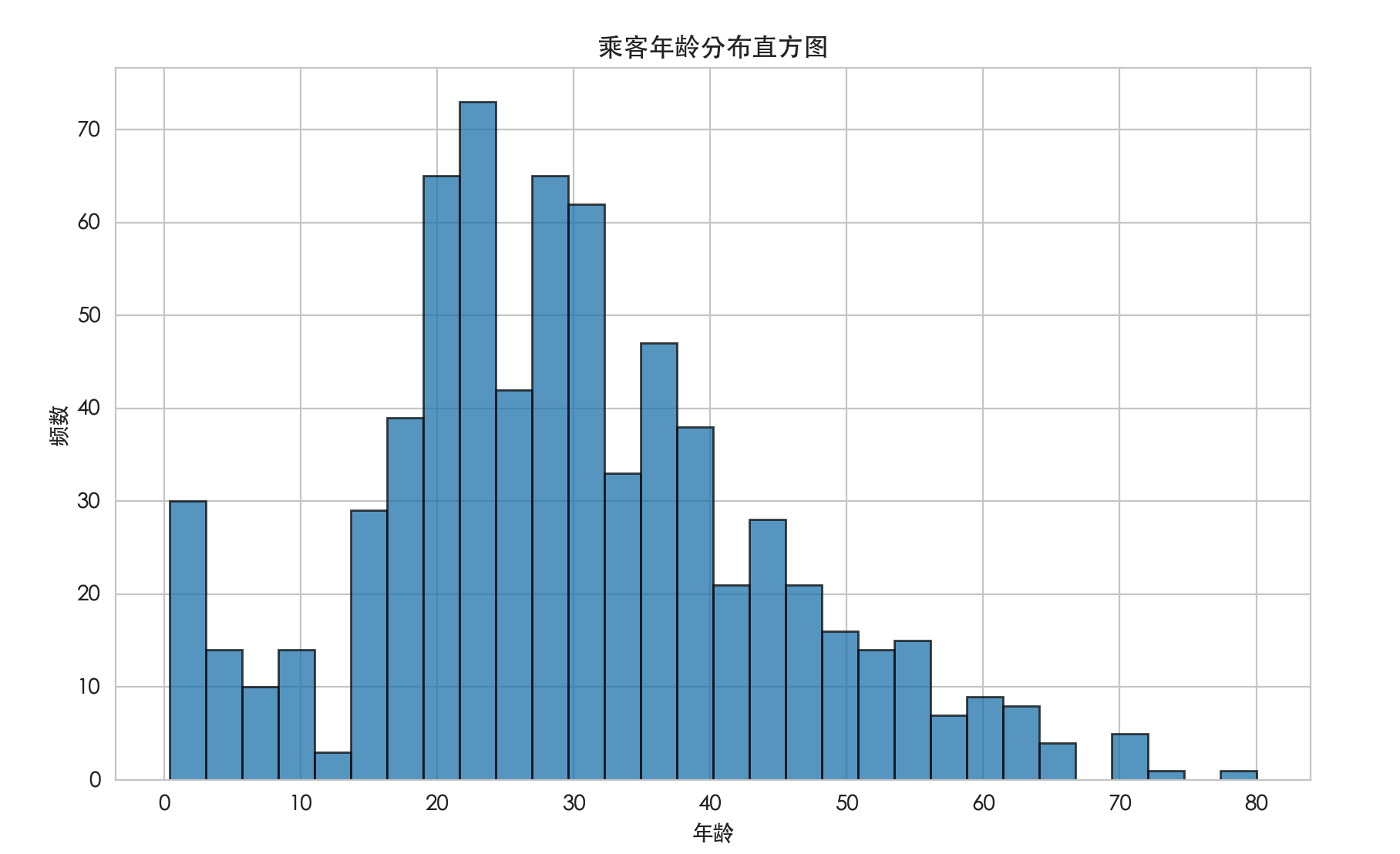 解读:这张图可以告诉我们乘客的年龄主要集中在哪个区间(例如 20-30 岁),分布是否对称,是否有异常值等。