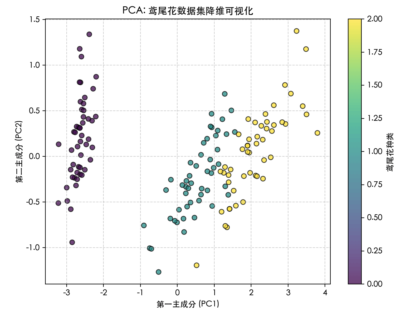 PCA(n_components=2):初始化模型,n_components参数指定要保留的主成分数量(即降维后的维度)。fit_transform(X):这是一个组合方法,先计算数据的均值和主成分方向(fit),然后立即将数据转换到新空间(transform)。explained_variance_ratio_:这是PCA一个非常重要的属性,它告诉我们每个新特征(主成分)保留了原始数据多少的方差(信息量)。这帮助我们决定选择多少个主成分是合适的。